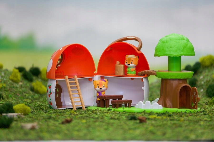 На дереве есть небольшой сарай с открывающейся дверью. , Поганка имеет лестницу, ведущую на второй этаж дома, стол со скамейкой и стулом.