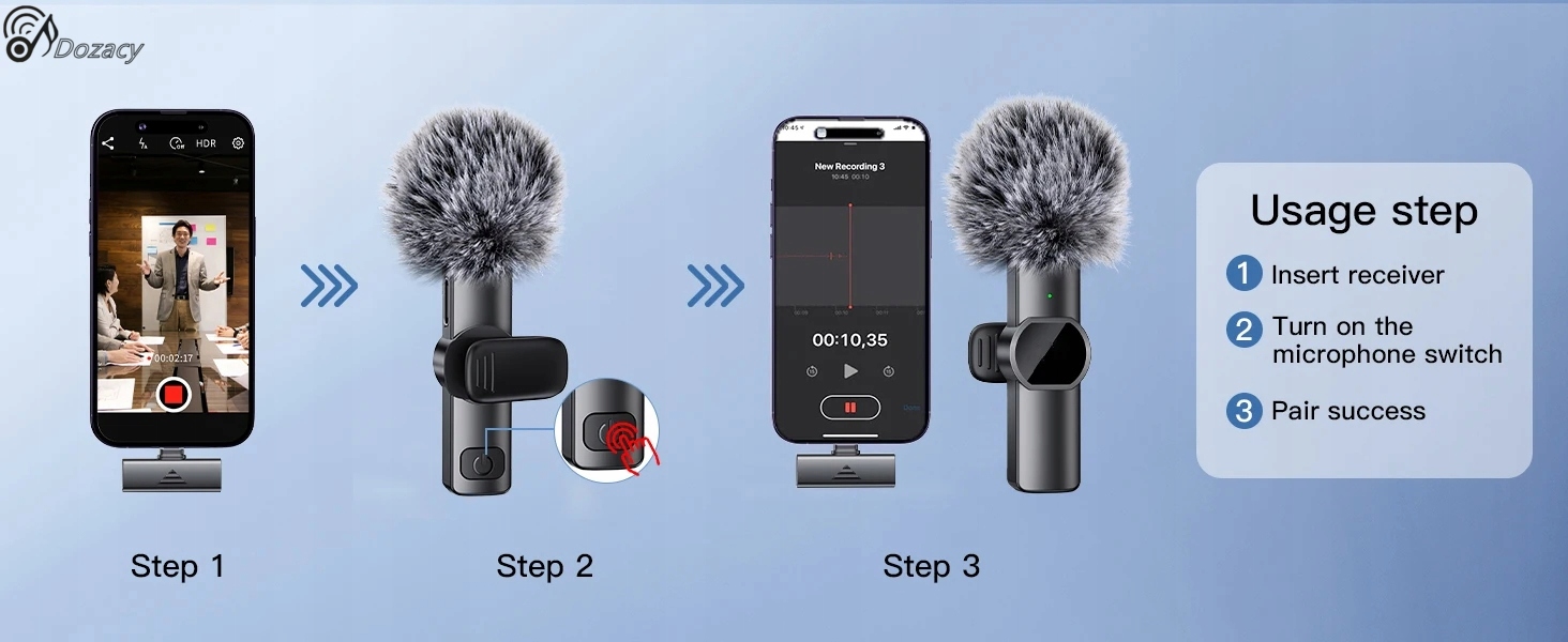 Подключите приемник к телефону и включите питание микрофона для автоматического сопряжения. (Примечание: если сопоставление не удалось, не волнуйтесь, просто выключите устройство и повторите попытку)