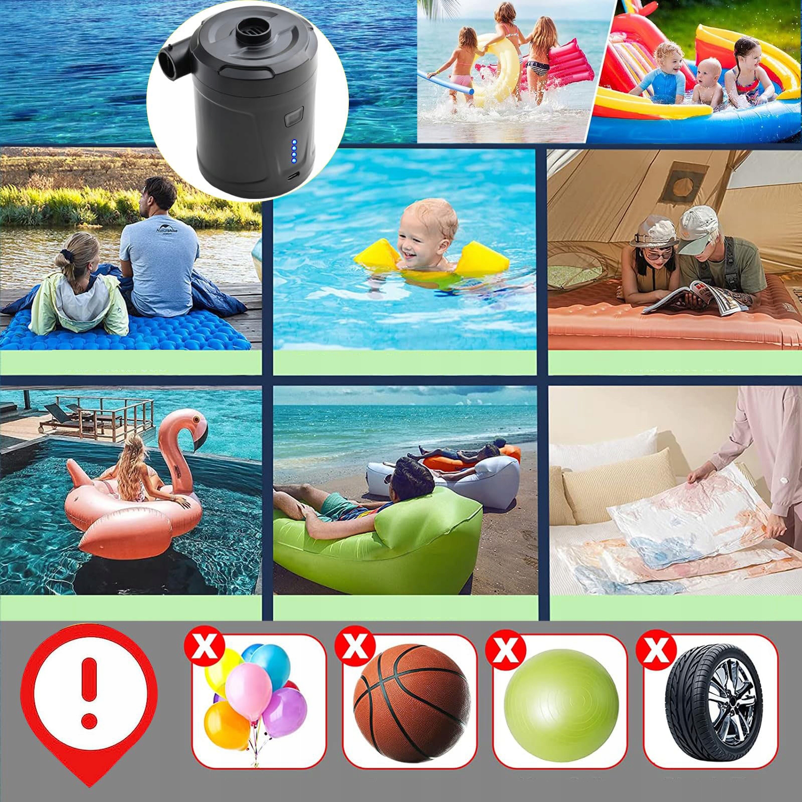 Универсальный электрический насос может надувать не только объекты, но и воздух. Надуваемый насос оснащен 3 различными сопла. Подходит для надувания многих продуктов, таких как надувные спальные мешки, плавающие колеса, надувные бассейны, плавание, игрушки, лодка, ложь, диван, шарики йоги и другие совместимые аксессуары