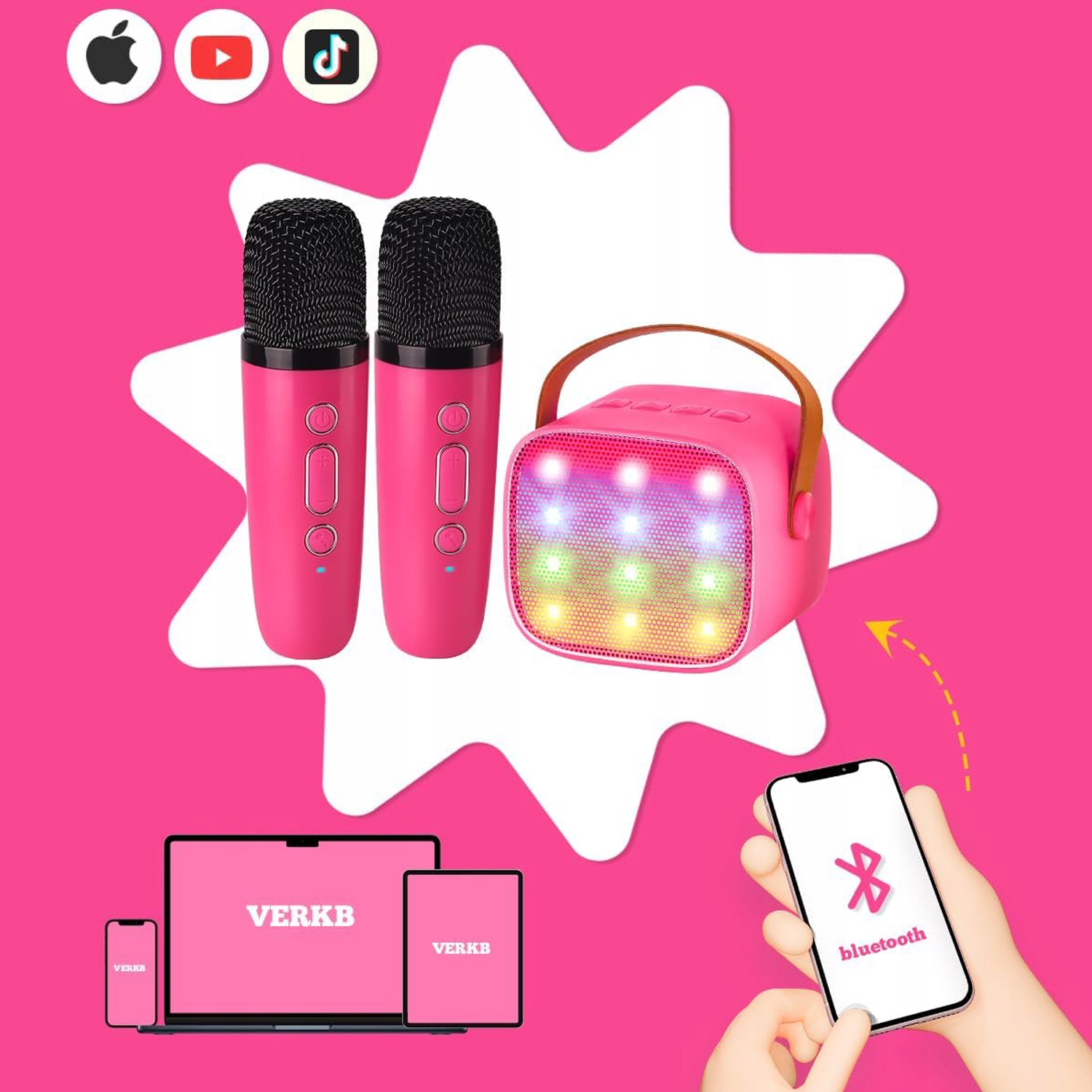 Компактная караоке-машина . Наша мини-караоке-машина с 4 типами волшебных голосов идеально подходит для детей всех возрастов. Светодиодные фонари пульсируют в такт музыке, создавая веселую атмосферу. Благодаря выходу для наушников он идеально подходит для занятий пением или семейного вечера караоке.