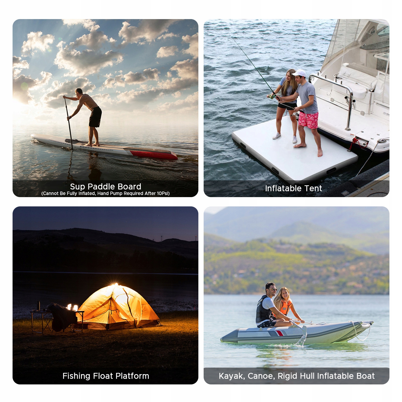 1. Инфляция высокого давления: достигает до 10 фунтов на кв. Дюйм, идеально раздувая продукты на высоком уровне спроса, таких как гребные плитки, надувные лодки и палатки.