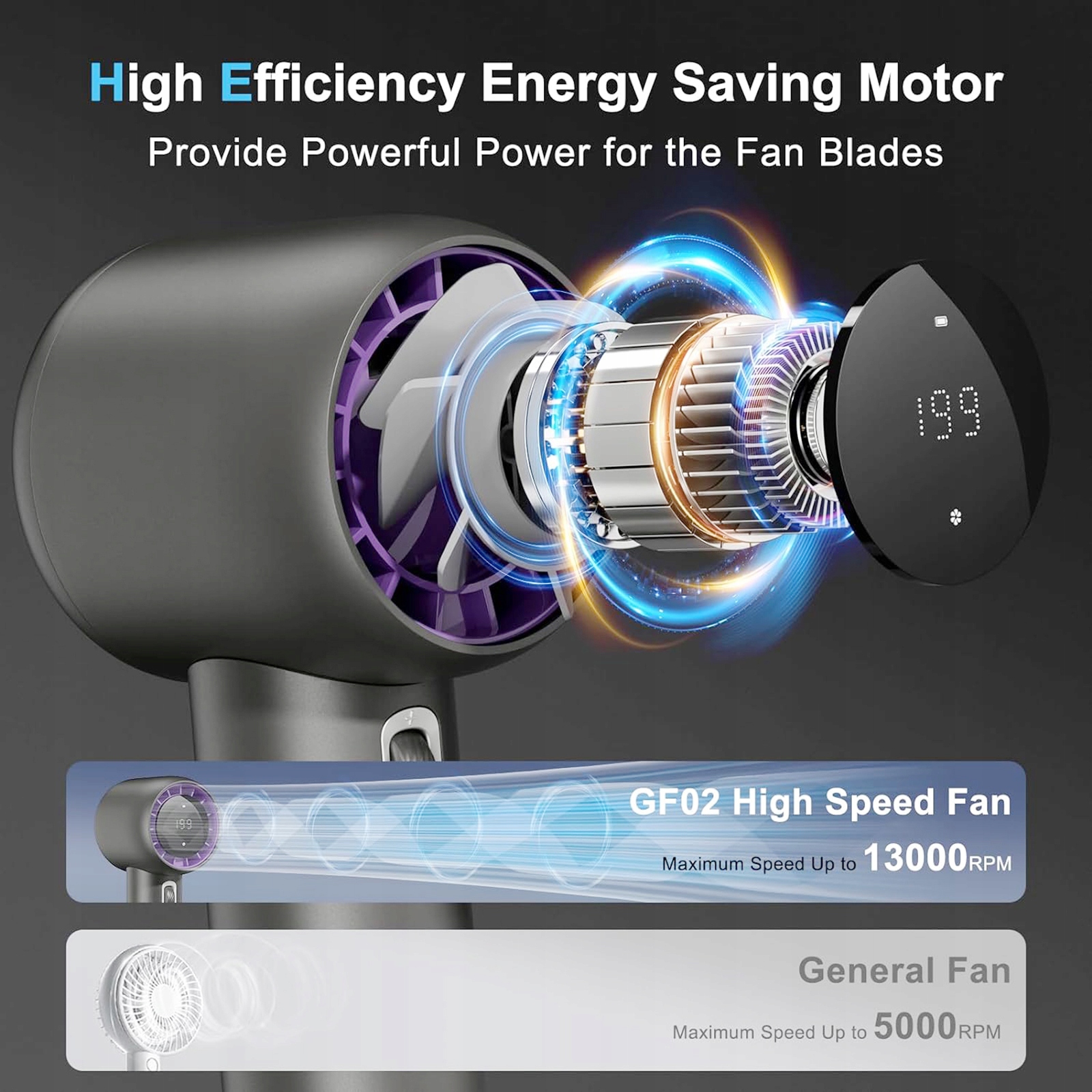 Удобный цифровой дисплей: встроенный аккумулятор 3500 мАч занимает 15 часов работы. Он также оснащен цифровым экраном высокого разрешения, который показывает текущую скорость ветра и оставшуюся мощность батареи, что позволяет пользователям легко контролировать уровни мощности.