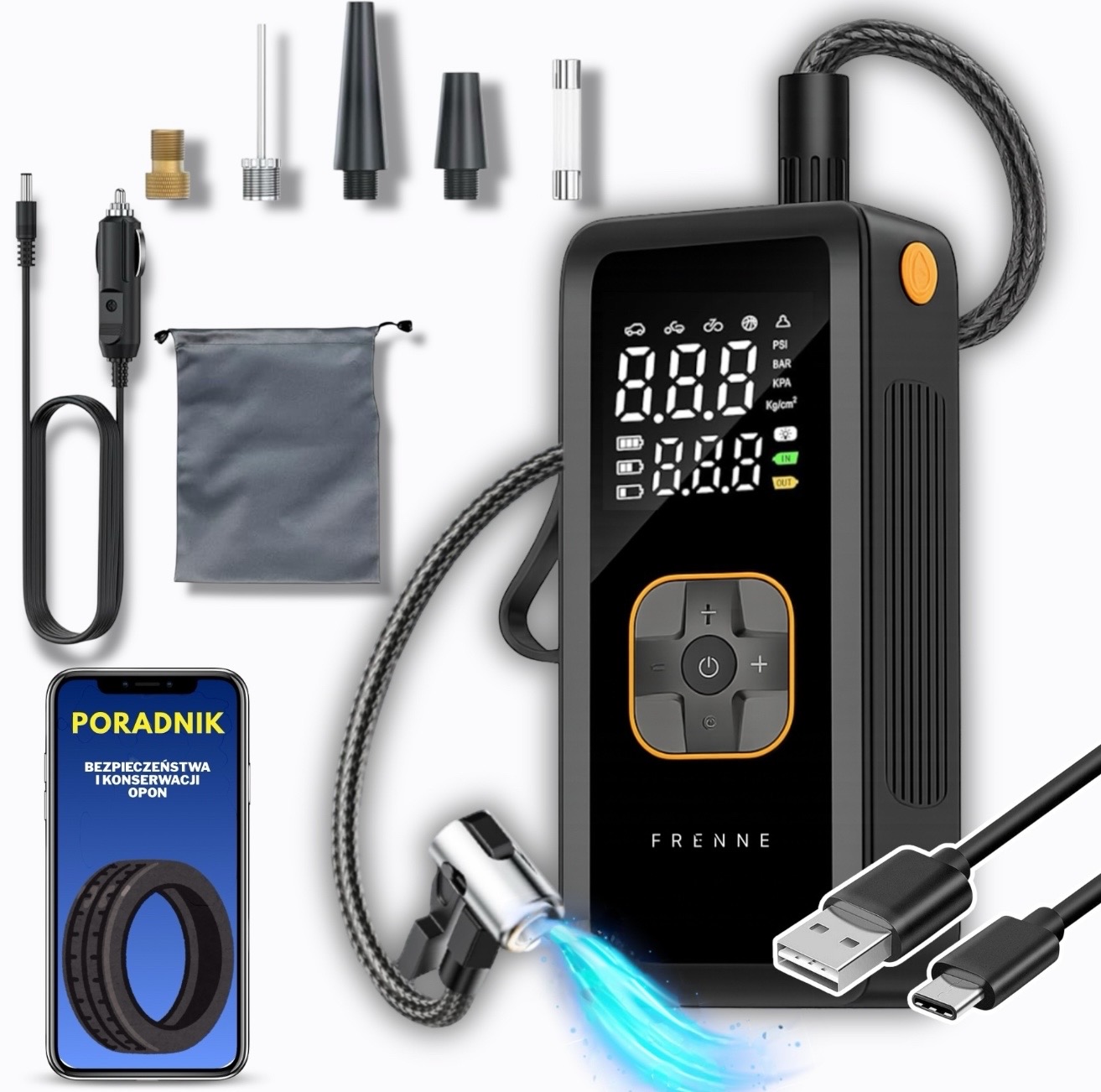 Frenne AirFlow Pro® — это больше, чем компрессор — это универсальное устройство, дающее вам полную независимость. Встроенный блок питания позволяет быстро заряжать смартфон, планшет или другие USB-устройства.