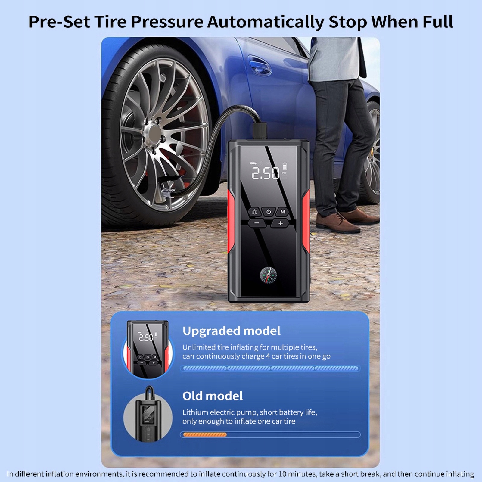 1. Автозаптатная остановка: установите желаемое давление в шине и дайте прыжке стартер и воздушный компрессор выполнить все остальное. Он автоматически остановится, когда шина будет полностью переоценит, нет необходимости в непрерывном мониторинге.