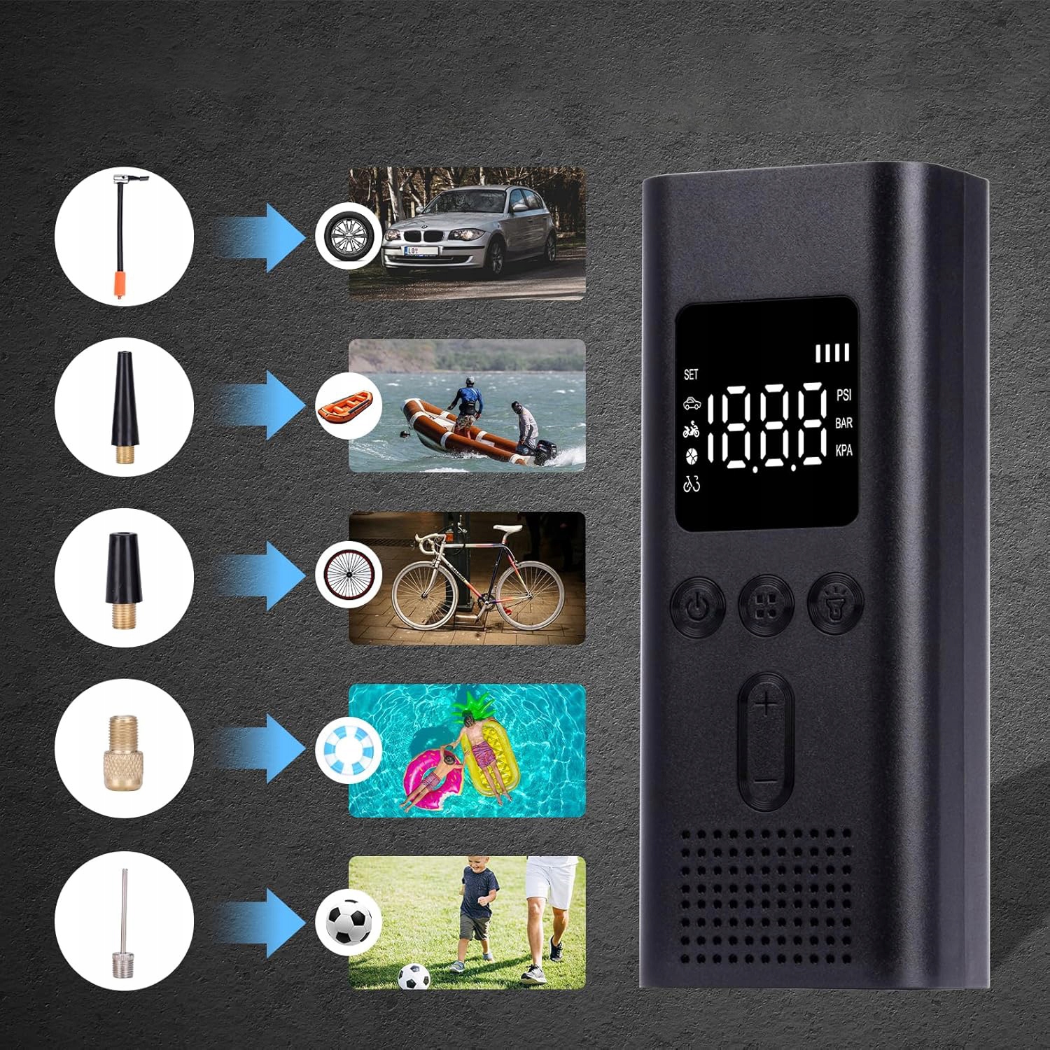 - Набор включает в себя насадку Шрейдера, сопло Presta и иглу для перекачки шариков, так что вы можете легко накачать автомобили, велосипеды, электрические велосипеды, мотоциклы, баскетбольные и футбольные шарики.