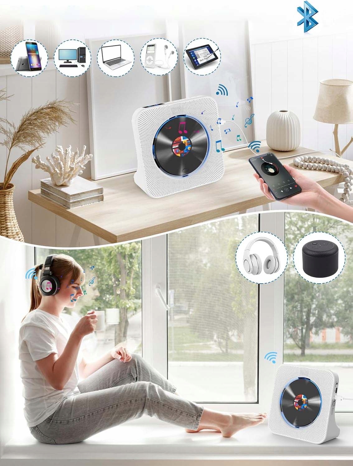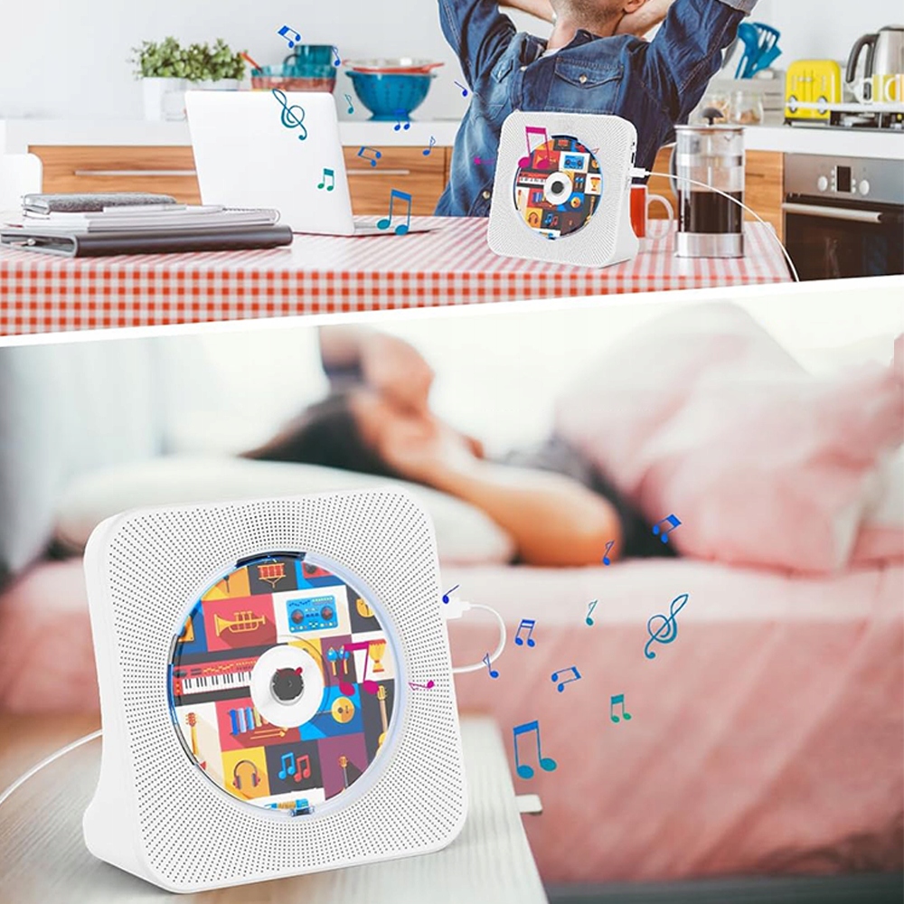 Настольный проигрыватель компакт-дисков можно подключить к другим устройствам с поддержкой Bluetooth (мобильному телефону/планшету/ноутбуку/airpods). Встроенные стереодинамики HI-FI проецируют звук и регулируют громкость по мере необходимости.