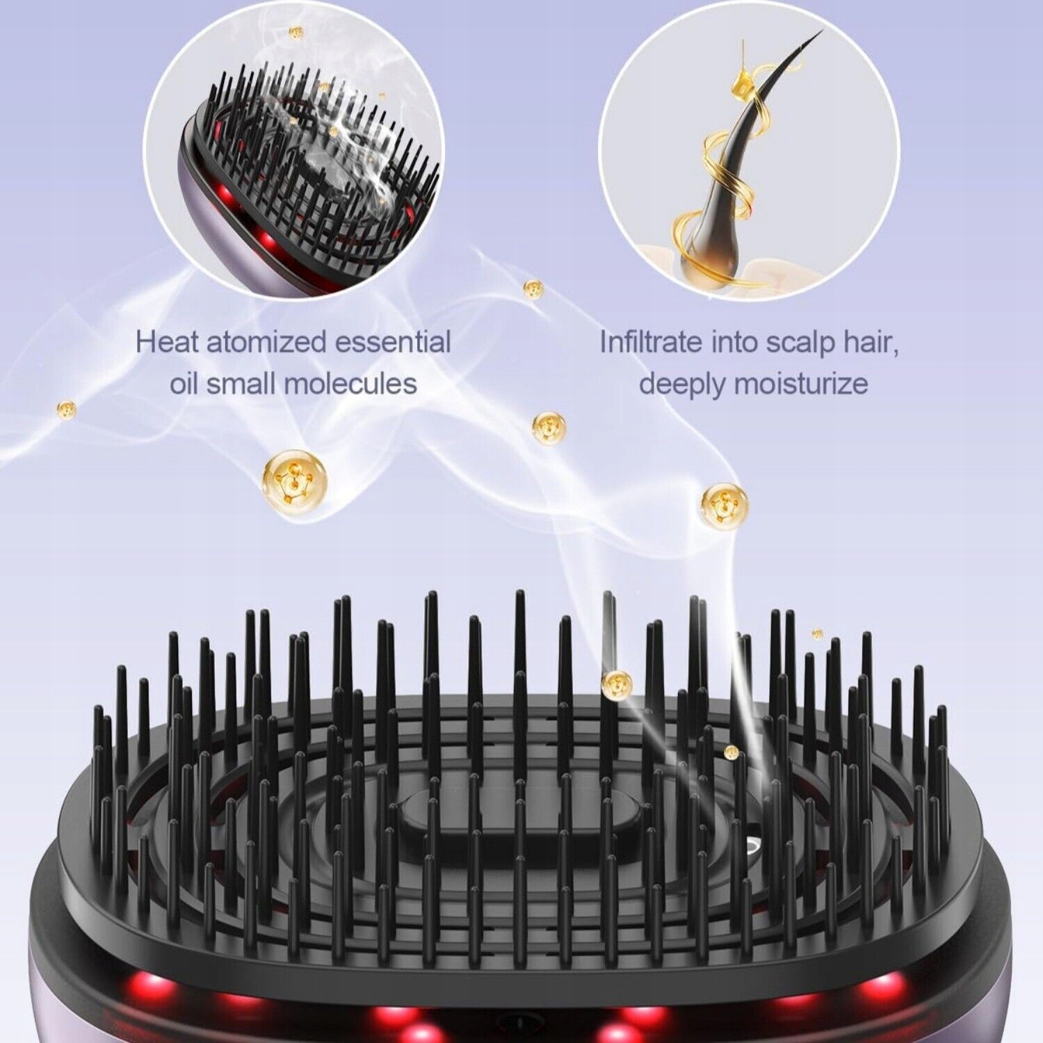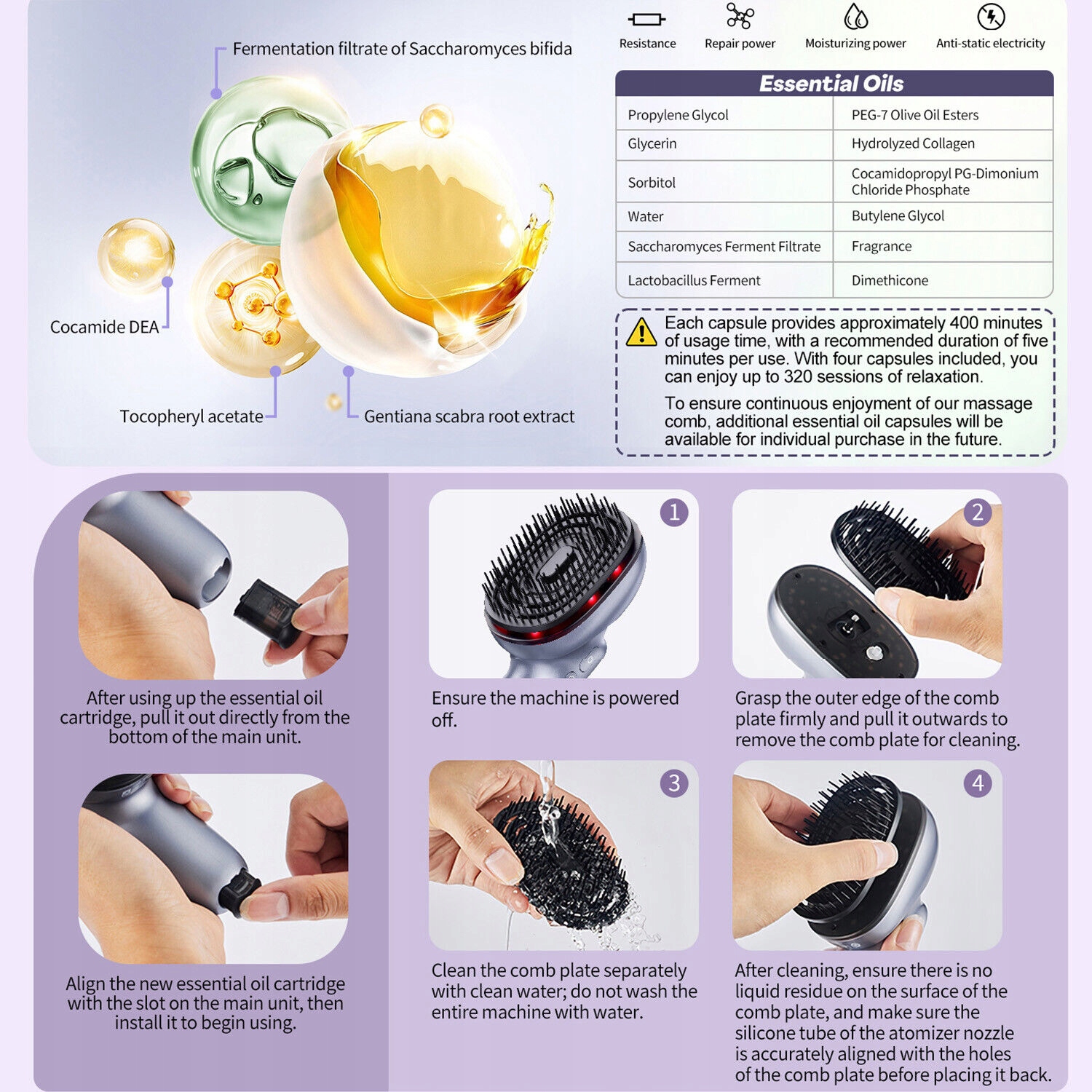 Аппликатор масла для волос: Наша щетка для кожи головы, оснащенная тремя магнитные вставки с эфирными маслами производительностью 1,3 мл/ч превращают эфирные масла в мелкие частицы, которые равномерно проникают в волосы и кожу головы. Примечание: 1. Массажная расческа подходит только для использования с нашими специально разработанными капсулами с эфирными маслами. Не подходит для использования с другими маслами. 2. Каждой капсулы хватает примерно на 400 минут использования, при этом рекомендуемая продолжительность использования составляет пять минут за раз. Благодаря трем включенным в комплект капсулам вы можете насладиться до 320 сеансами релаксации.3. Чтобы обеспечить вам непрерывное удовольствие, в будущем мы предложим дополнительные капсулы с эфирными маслами для индивидуальной покупки.