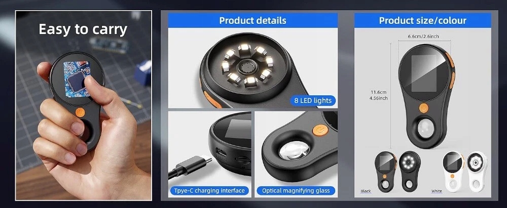 Портативный ручной цифровой микроскоп с 2,0 -дюймовым экраном с пикселем 200 Вт, Black