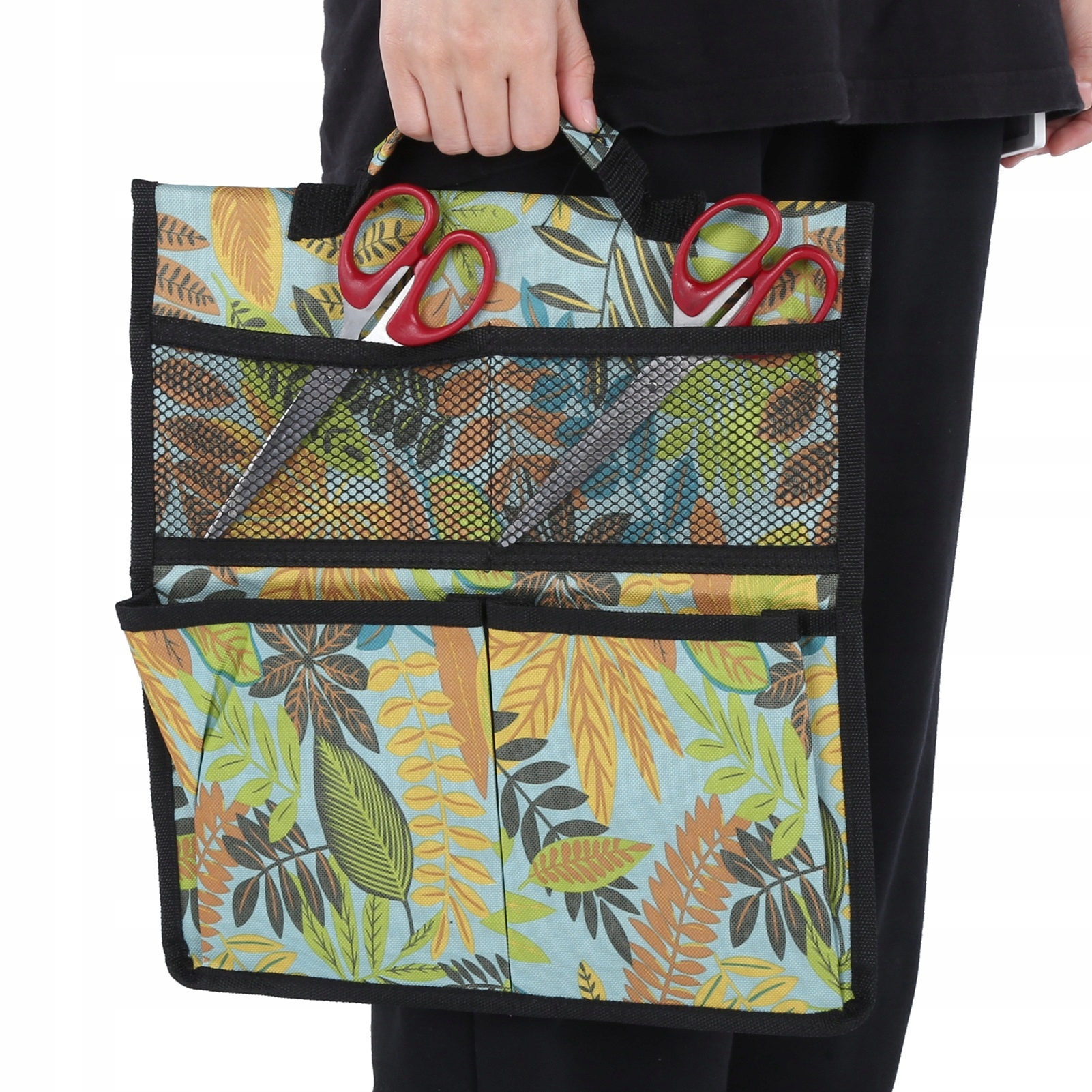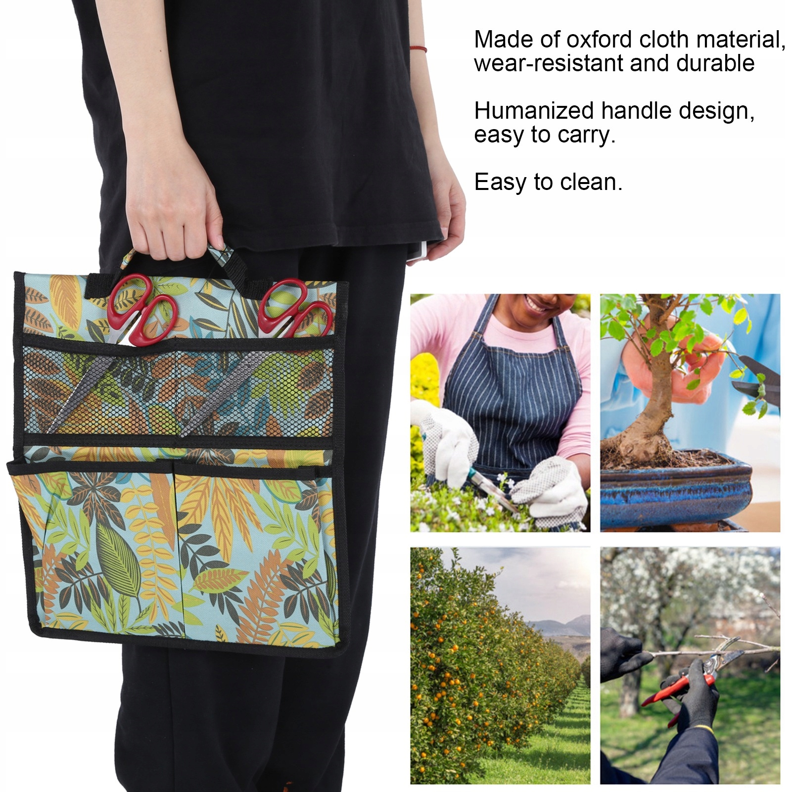 1. Изготовлен из ткани Оксфорд, износостойкий и прочный. 2. Легко складывается, не занимает места при хранении. 3, гуманизированный дизайн ручки, легко носить с собой. И легко чистится. 4. Два способа использования. Его можно повесить на садовые подставки или скамейки. 5. Многофункциональный, также можно использовать в качестве других сумок для хранения инструментов. 6, подходит для семейных и других мест отдыха, в основном используется для хранения инструментов для обрезки, инструментов для прополки и т. д.