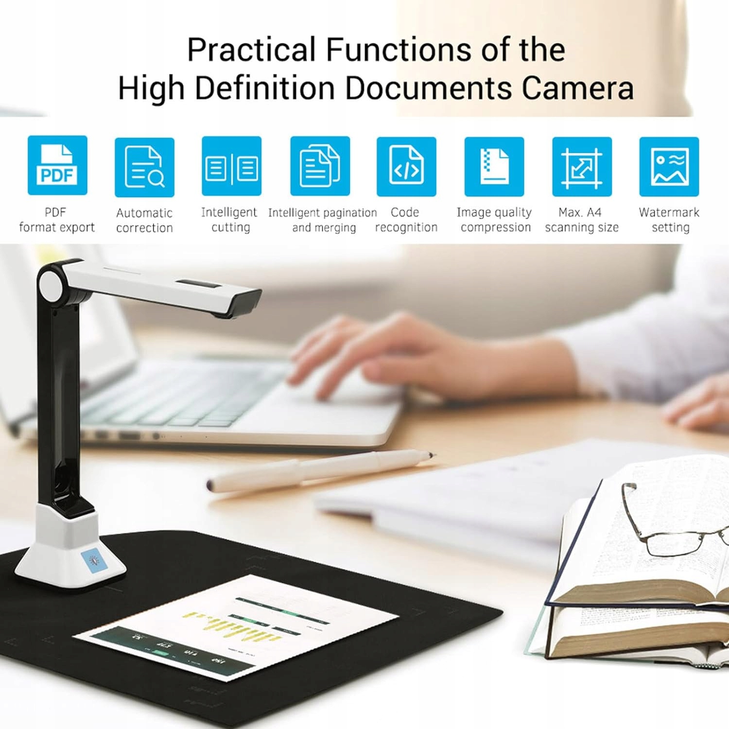 Сканер книг и документов, оснащенный камерой 8 Мп, сканирующей различные документы формата A4, записывающей видео и заполняющей светодиодной подсветкой. Многофункциональный сканер поддерживает экспорт PDF, автоматическую коррекцию, интеллектуальную резку, интеллектуальное разбиение на страницы и объединение, распознавание кода, сжатие качества изображения, настройку водяных знаков и так далее. Яркие светодиоды. 3 уровня светодиодов позволяют сканеру документов работать даже в слабоосвещенных помещениях. Операционное программное обеспечение можно загрузить из руководства, оно поддерживает семь языков: немецкий, русский, французский, японский, испанский, итальянский и английский, а руководства также доступны на этих семи языках. Широкое применение макс. Размер сканирования – A4, его можно использовать для сканирования документов разных размеров.