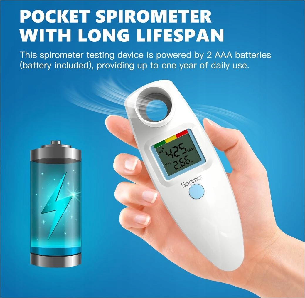 Карманный спирометр с длительным сроком службы: это устройство для тестирования спирометра питается от 2 батарей типа АА, что обеспечивает до одного года ежедневного использования. Его компактный карманный дизайн позволяет удобно носить его в сумке и проверять функцию легких в любое время и в любом месте.