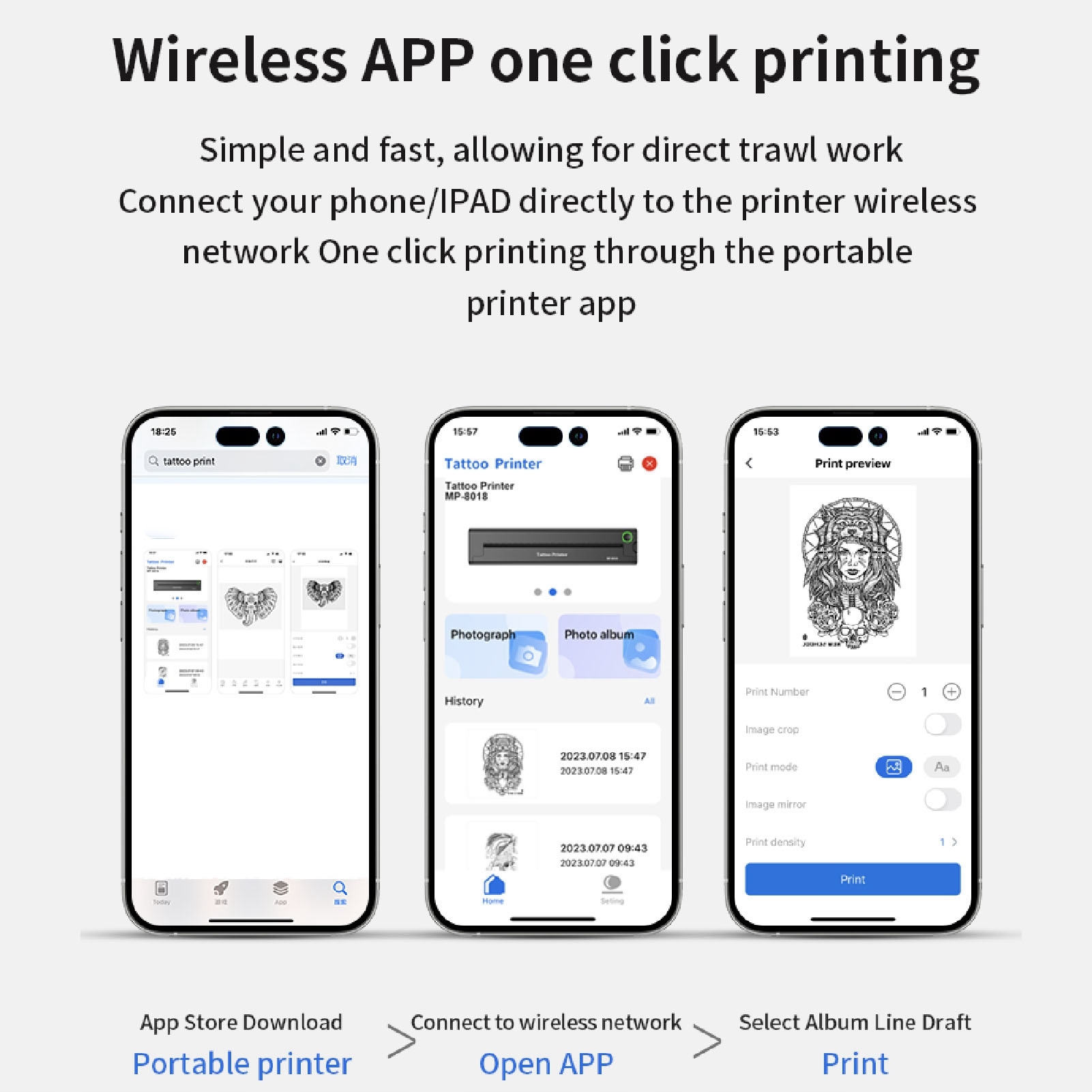 ⏹Простота в эксплуатации:машина автоматически ремонтирует переводную бумагу. Просто используйте приложение и эффективно копируйте свои татуировки на трансферной бумаге.