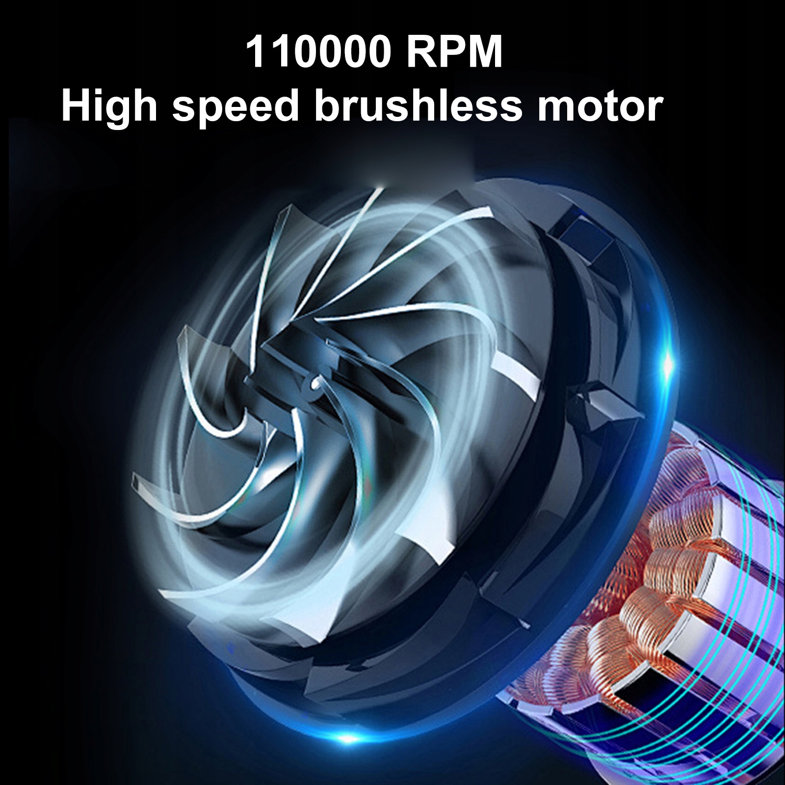 2. Снятие турбо -вентиляционной пыли: пылевой воздуходувка имеет быстрый бесщеточный двигатель с 110 000 об/мин, создавая сильную скорость ветра 45 м/с для мощной и эффективной эффективности очистки, обеспечивая чистую и свежую среду.