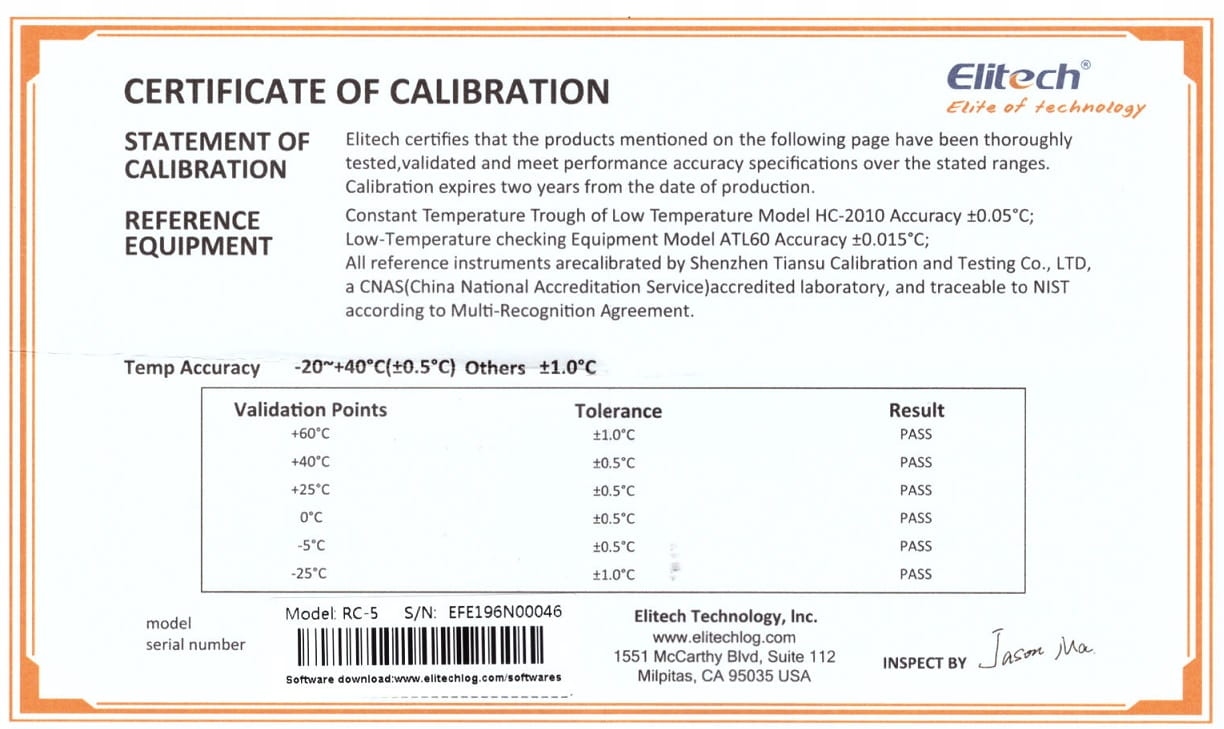 В стандартной комплектации диктофон имеет сертификат калибровки, выданный компанией Elitech Technology, Inc.