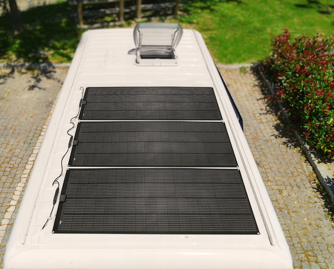 Покрыт полугибким покрытием, позволяющим удобно устанавливать его на крышу автомобиля или другие слегка закругленные поверхности. В комплект входит кабель MC4 и крепежные заклепки. Полные размеры устройства: 1585x710x2,8 мм.