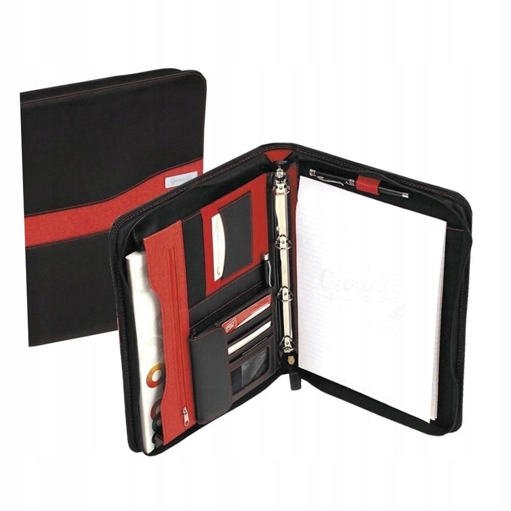 Папка была сделана из экологической черной кожи, с красными добавками, которые добавляют динамику. Это выглядит элегантно и легко чистить.