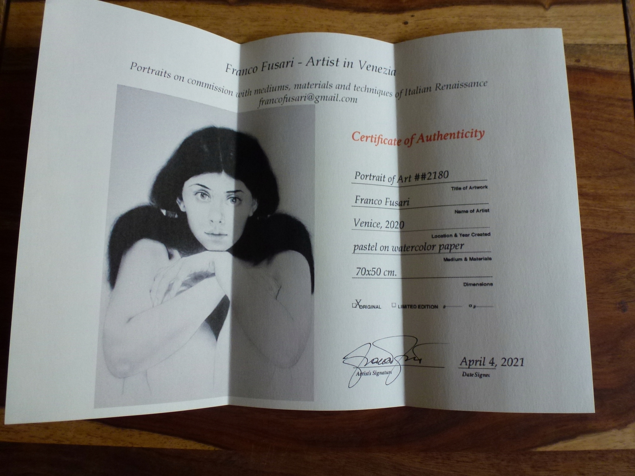 gianfranco fusari - родился в 1945 году, живет в Венеции и Вероне. Его отец был скульптором в мраморе, а в семье со стороны его матери многие предки были профессиональными художниками и скульпторами. Среди них был фаворит Наполеона Бонапарта Анджело Пицци. Наполеон, завоевав Венецию в 1797 году, назначил его директором Академии изящных искусств и приказал создать наполеоновский неф на площади Сан -Марко, перед собором Санкт -Марка в Венеции. Джанфранко Фусари продолжает семейные традиции: его работы выставлены в музеях по всему миру, например, Музей изобразительных искусств округа Вашингтон или басовый музей искусств в Майами и продается в художественных галереях, особенно в США, Великобритании, Финляндии и Индии. Характерной особенностью художника является любовь к искусству эпохи Возрождения. Работая только на бумаге, Фусари время от времени использует аутентичные материалы, приготовленные с теми же методами и в том же месте, что и во время итальянского эпохи Возрождения. Фусари, вдохновленный красотой женского лица и фигуры, чувствует, что настоящее произведение искусства - это тело, которое он переносит на бумагу.