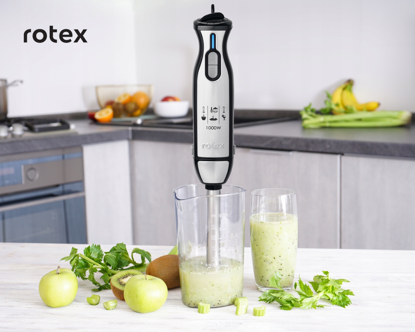 - Rotex Hand Blender -это многофункциональное устройство, которое будет идеальным на каждой кухне. Благодаря мощности 1000 Вт и два, режиму рабочим режимам с регулированием скорости на корпусе, устройство может справиться с смешиванием, раздавливанием льда, рубкой овощей, взбивая пену или заминки тесто. Прочные ножи из нержавеющей стали, покрытые титановым покрытием, обеспечивают долговечность и точность работы, даже во время интенсивного использования.