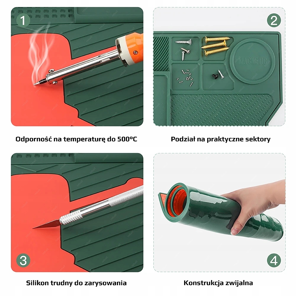 Нескользящий силиконовый коврик легко сложить или свернуть, он очень мягкий, легко хранить, легко чистится и сразу же ополаскивается. водой или мылом из-под крана. Его поверхность утолщена силикагелем, антикоррозионная, антипригарная. После высыхания паяльной пасты/припоя их можно легко снять.