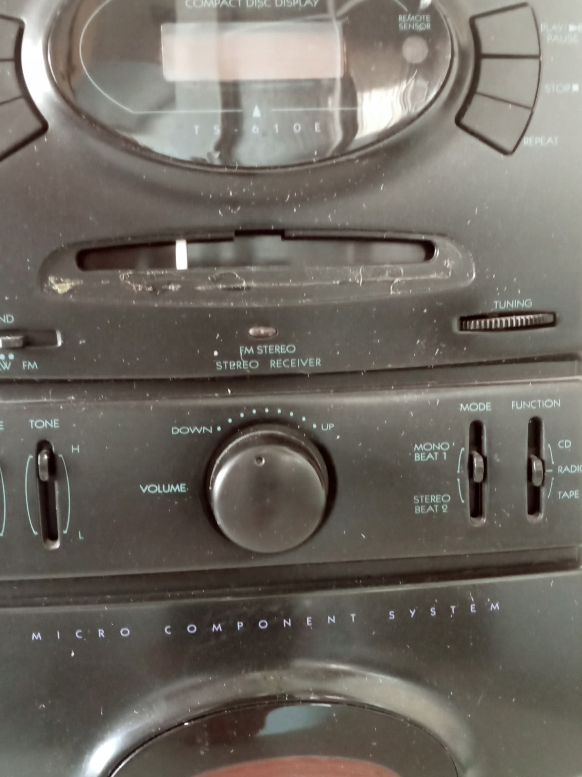 После включения свет горит, но никакие функции не работают, воспроизведение, перемотка назад и т.д. на потенциометре нет стекла, ручка оповещения затерта, лазер не проверялся, возможно поврежден