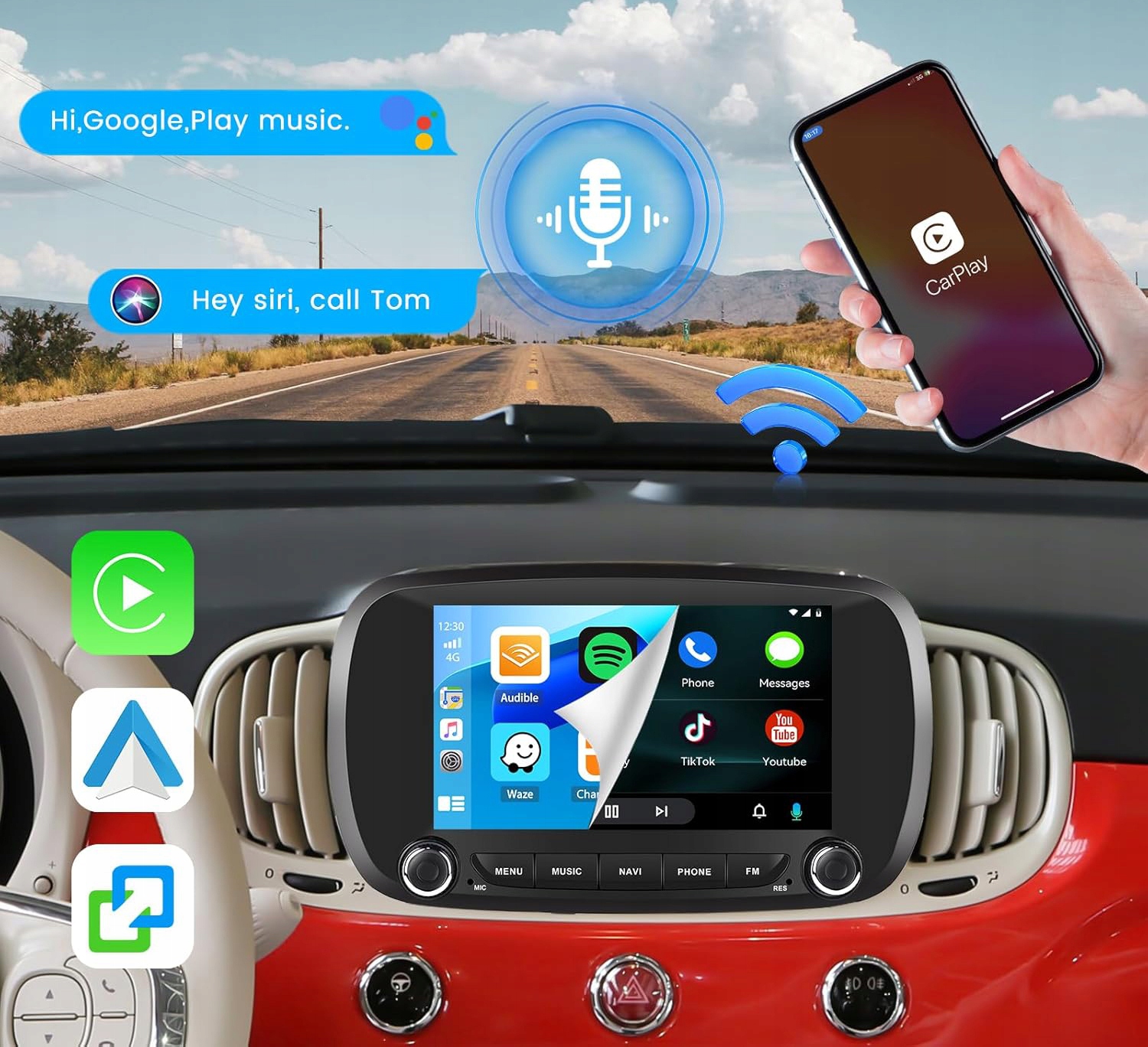 Apple CarPlay, Android Auto: радиоприемник Carplay, специально разработанный для Fiat 500X, поддерживает голосовые команды Carplay/Android Auto, что позволяет вам управлять телефоном с помощью голосовых команд «Привет, Siri» и «Привет, Google». Вы можете совершать телефонные звонки, использовать карты, слушать музыку и получать информацию на этом экране Carplay