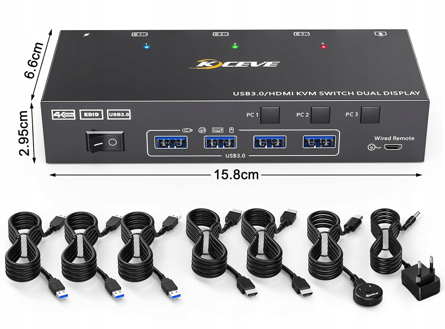 KVM Переключатель с двумя мониторами с 4 портами USB 3.0 до 5 Гбит/с - переключатель KVM с двумя мониторами для 3 компьютеров позволяет делиться 2 мониторами и 4 устройствам USB 3.0 без отсоединения плагинов, а также безопасной идентификации клавиатур, мышей, принтеров, сканеров и других беспроводных USB. USB -коммутатор HDMI 3.0 поддерживает 5 ГБ/с и является задним числом совместимы с устройствами USB 2.0/1.1. Совместим с HDMI 2.0, HDCP2.2.