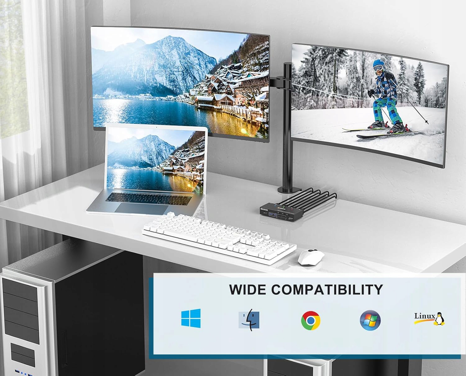 Широкая совместимость и широкое приложение - коммутаторы KVM поддерживают различные входные устройства или источники HDMI, такие как компьютеры, ноутбуки, телевизионная коробка, Apple TV, PS3, PS4, PS5, Blu -Ray Players, проекторы. Не требуется дополнительного программного обеспечения контроллера. Этот KVM 3 Switch Computers 2 Мониторы HDMI совместимы с Windows 7/8/10/11/XP/Vista, Mac OS, Linux и Chrome. Обычно используется в офисах, деловых семинарах, мультимедийном обучении, домашнем кино, исследовательских тестах и т. Д.