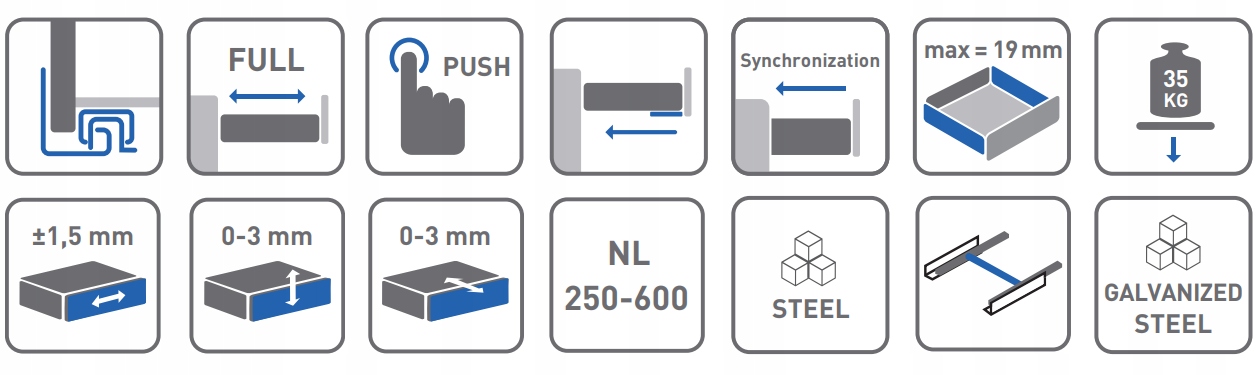 Направляющая нижней части Modern Slide Pro, открывающаяся нажатием, доступна в восьмимерных вариантах. Изготовлен из стали, покрытой цинковым покрытием для защиты от коррозии. В нем используется технология сборки слайд-он. Ящики, оснащенные механизмом «push to open», открываются после легкого нажатия на переднюю часть, что облегчает повседневное использование в помещениях, где необходим удобный доступ к продуктам без использования ручек. Полное выдвижение открывает доступ на всю глубину ящика, а регулировка по вертикали облегчит процесс сборки и правильную регулировку направляющей ящика. Изделие универсально применимо для ящиков с боковыми стенками из материала толщиной до 16-19 мм. Кроме того, долговечность изделия сертифицирована на 60 000 циклов и выдерживает нагрузку до 35 кг. Возможность использования перекладины для синхронизации направляющих PB-SYNCHROP2O-PRO.