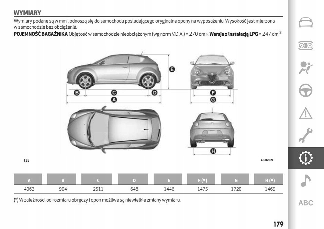 Руководство пользователя Mito содержит все версии оборудования и полезную информацию о том, как эффективно и безопасно использовать автомобиль, например. - индикаторы, контрольные лампы открытия и закрытия - освещение и обзорность, сиденья, отсеки для хранения вещей, отопление, вентиляция, кондиционер - советы по вождению, эксплуатации, обслуживанию автомобиля - уровни жидкостей, проверка и доливка, аварийные операции, замена колес, предохранителей, замена лампочек - технические данные... и многое другое, обеспечивающее ощущение безопасности и комфорта для путешественников. Польское законодательство обязывает продавца приложить к товару инструкцию по эксплуатации автомобиля на польском языке. Руководство пользователя автомобиля новое, на польском языке.