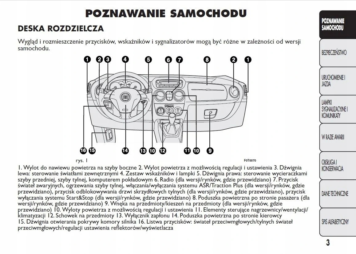 Руководство по эксплуатации Fiat содержит все версии оборудования и полезную информацию о том, как эффективно и безопасно использовать автомобиль, например: - индикаторы, контрольные лампы, открытие и закрытие - освещение и обзорность, сиденья, отсеки для хранения вещей, отопление, вентиляция, кондиционирование воздуха - советы по вождению, эксплуатации, обслуживанию автомобиля - уровни жидкостей, проверка и доливка, аварийные операции, замена колес, предохранителей, замена лампочек - технические данные... и многое другое, дающее путешественникам ощущение безопасности и комфорта. Польское законодательство обязывает продавца приложить к автомобилю руководство по эксплуатации на польском языке. Руководство пользователя автомобиля новое, на польском языке.