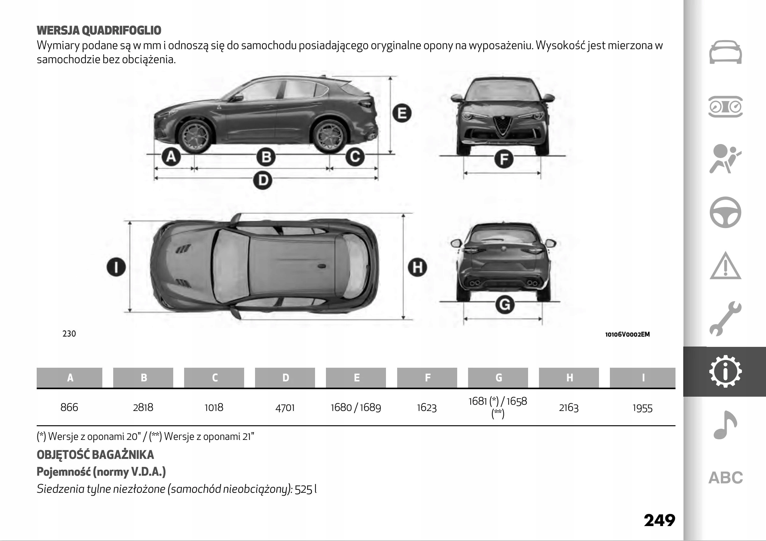 Руководство пользователя Alfa Romeo содержит все версии оборудования и полезную информацию о том, как эффективно и безопасно использовать автомобиль, например: - индикаторы, контрольные лампы, открывание и закрывание - освещение и обзорность, сиденья, отсеки для хранения вещей, отопление, вентиляция, кондиционирование воздуха кондиционирование - вождение, советы по эксплуатации, обслуживание автомобиля - уровни жидкостей, проверка и доливка, аварийные операции, замена колес, предохранителей, замена лампочек - технические данные... и многое другое, дающее путешественникам ощущение безопасности и комфорта. Польское законодательство обязывает продавца приложить к автомобилю руководство по эксплуатации на польском языке. Руководство пользователя автомобиля новое, на польском языке.