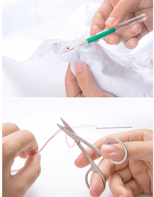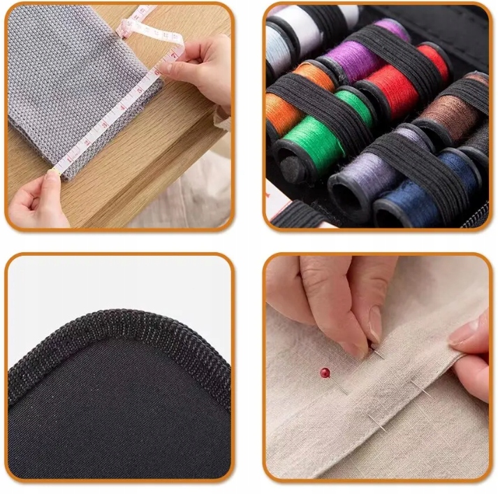 Набор помещен в практичный футляр на молнии, в котором можно разместить все аксессуары, такие как иголки, нитки, булавки, ножницы, рулетка и т. д. Гибкие резиновые ленты внутри футляра защищают аксессуары от потери.< /п>