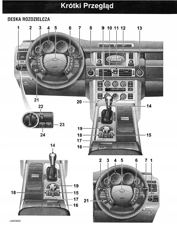 Руководство пользователя Land Rover содержит все версии оборудования и полезную информацию о том, как эффективно и безопасно использовать автомобиль, например: - индикаторы, контрольные лампы, открывание и закрывание - освещение и обзорность, сиденья, отсеки для хранения вещей, отопление, вентиляция, кондиционирование воздуха кондиционирование - вождение, советы по эксплуатации, обслуживание автомобиля - уровни жидкостей, проверка и доливка, аварийные операции, замена колес, предохранителей, замена лампочек - технические данные... и многое другое, дающее путешественникам ощущение безопасности и комфорта. Польское законодательство обязывает продавца приложить к автомобилю руководство по эксплуатации на польском языке. Руководство пользователя автомобиля новое, на польском языке.