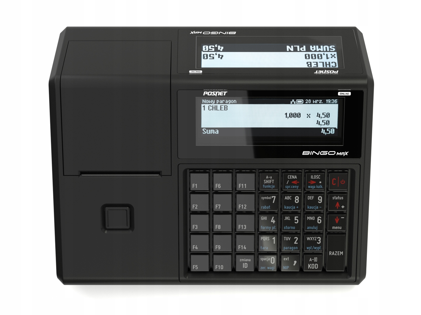 Кассовый регистр Bingo Max имеет современную конструкцию, небольшой размер (249 x 99 x 207 мм), интуитивная и удобная клавиатура, которая гарантирует комфорт при использовании устройства. Макс, подключаясь к ИТ -поддержке устройств продаж, среди прочего: