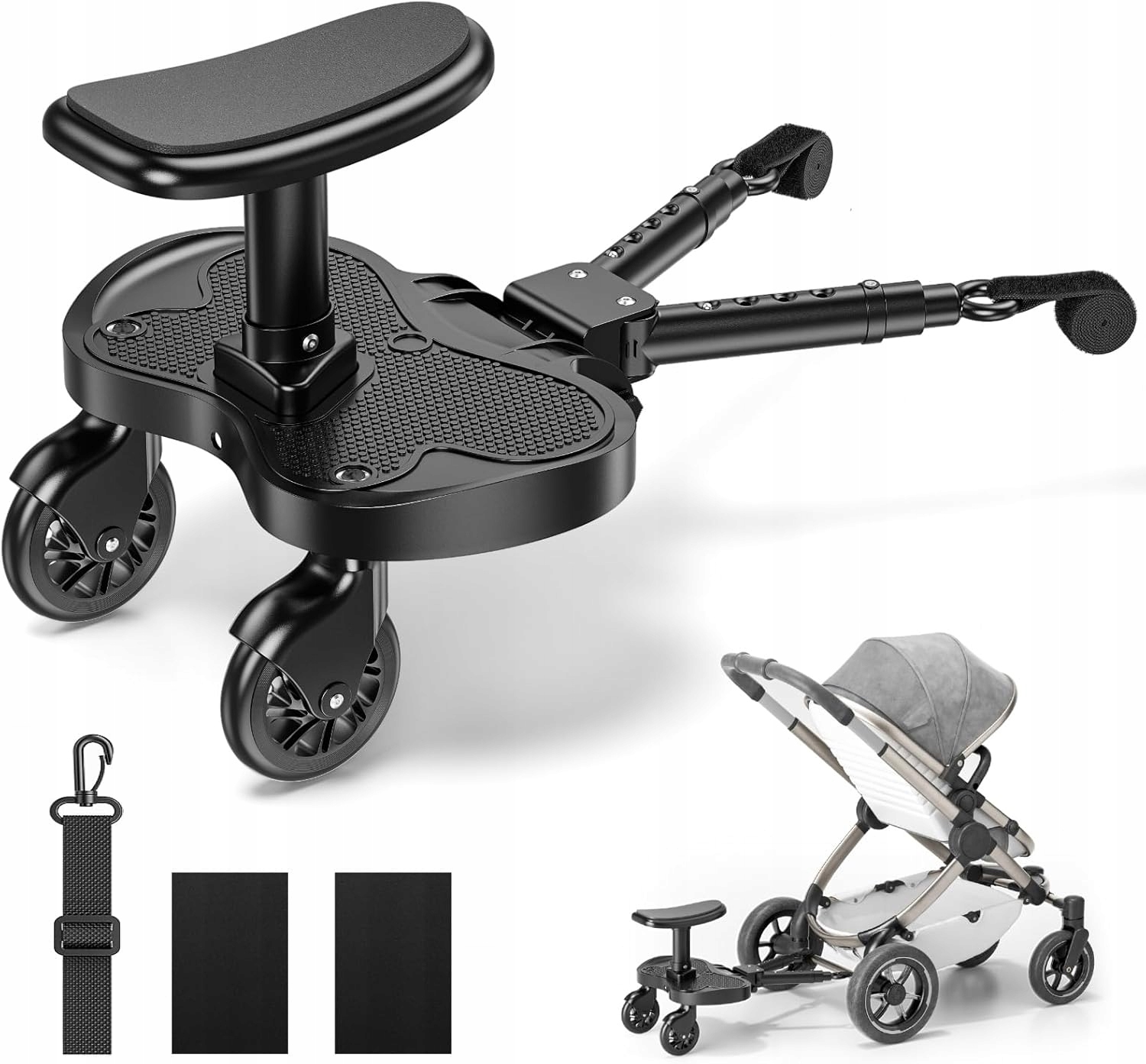 - коляска для сидения или стояния - Это последнее наложение весла со съемным сиденьем, благодаря тому, что дети могут сидеть на сиденье или стоять на платформе во время путешествия. С большинством колясок, прикрепленных с регулируемыми клейкими лентами. После прикрепления ремней, потяните их по бокам рамы троллейбуса, чтобы получить их. Вы можете сэкономить место, повесив его в инвалидной коляске с ремнем для хранения, если вы не хотите полностью снимать доски.