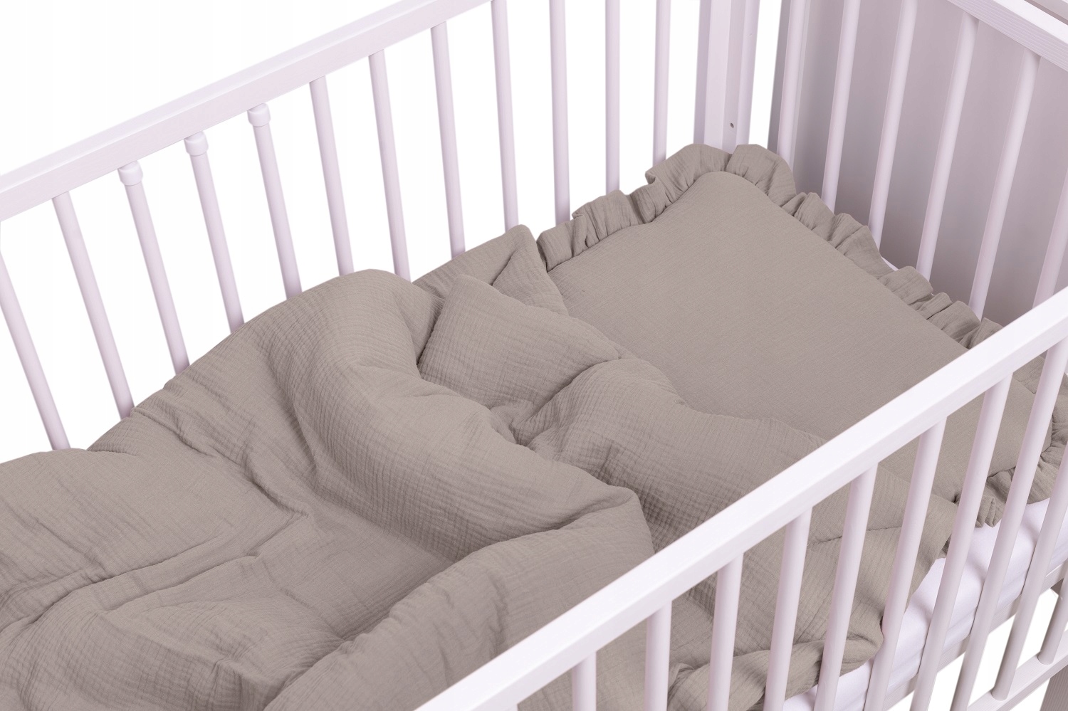 ➡️ Комплект постельного белья изготовлен из двойного марлевого хлопкового муслина высочайшего качества. Состоит из подушки размером 40х50см, отделанной декоративной рюшей, и одеяла размером 120х90см.