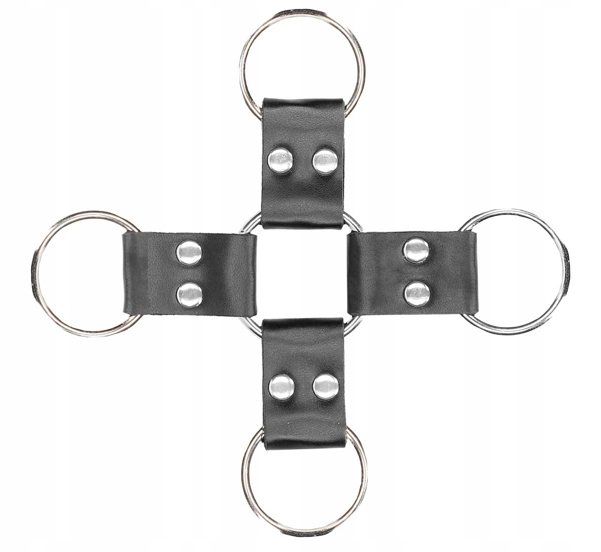 Очень эффектный и функциональный набор, состоящий из наручников на руки и ноги. Наручники дополнительно оснащены системой, состоящей из пяти колец, четырех карабинов и нескольких колец.