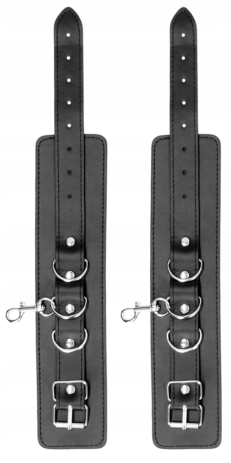 Очень эффектный и функциональный набор, состоящий из наручников на руки и ноги. Наручники дополнительно оснащены системой, состоящей из пяти колец, четырех карабинов и нескольких колец.