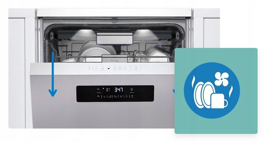 После того, как дверь для мытья посудомоечной машины, мытье цикла посудомоечной машины откроется автоматически, благодаря тому, что блюда, собранные в середине, высохнут гораздо быстрее - и без вашего вмешательства. Благодаря этому решению, посудомоечная машина также потребляет меньше электричества, достигая высокоэнергетического класса