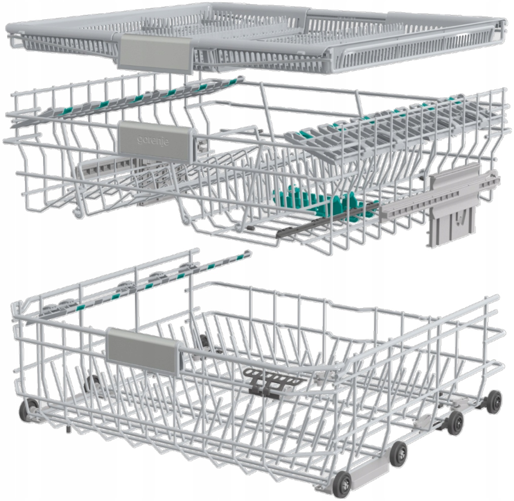 Корзины оснащены движущимися элементами с подсветкой и настраиваемым расположением корзин для облегчения загрузки. Очень простая двухуровневая система регулировки корзины позволяет разместить даже самые большие кастрюли и тарелки. Полку для тарелок в нижней корзине можно легко сложить. Столовые приборы можно идеально разместить на специальном подносе, где они размещаются отдельно, обеспечивая идеальные результаты очистки и сушки. Каждая деталь тщательно продумана, чтобы обеспечить максимально простое управление.