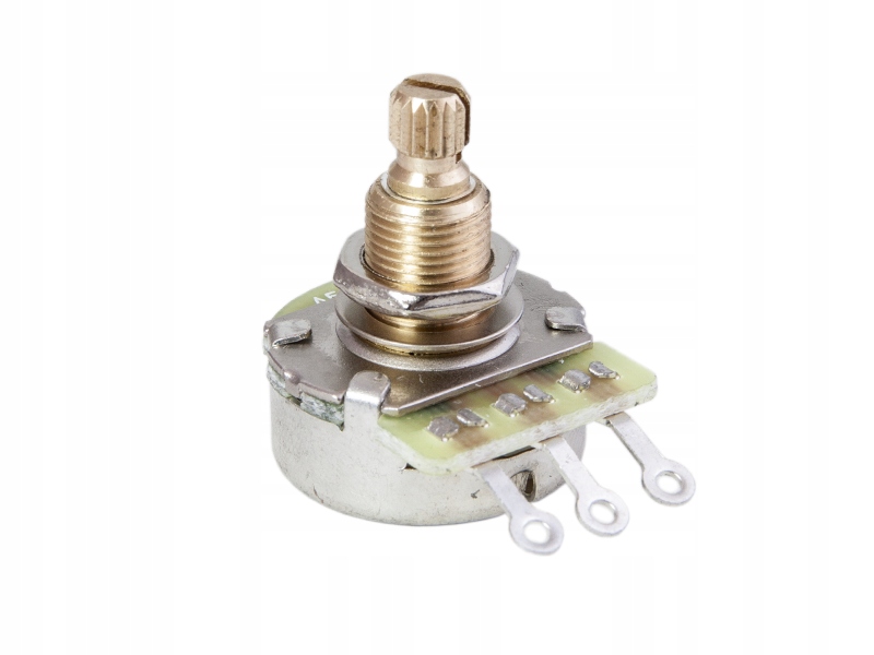 Как правило, потенциометры доступны с тремя длинами контактов: короткий (15 мм) предназначен для установки на накладки и платы управления, стандартный (18 мм) для установки в древесину гитары и длинный (26 мм), используемый в гитарах GIBSON Les Paul. Аудио (логарифмические) потенциометры обычно применяются для регулировки громкости, линейные для тона. Разделив их по сопротивлению: 250К для сингловых звукоснимателей, 500К для хамбакеров и 25К для активных цепей.