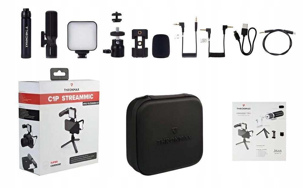 thronmax shotgun pro , штатив, держатель смартфона, поп-фильтр, чехл, 2-кратный домкрат 3,5 мм/кабель Джека 3,5 мм, кабель USB-C/USB-A, кабель USB-C/Джек/Джек 3,5 мм, светодиодная лампа, переход с нитью, закрепление к ветке холодной ноги, документация.