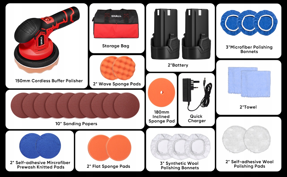 [богатая комбинация]: вы получите лак для батареи, литийную батарею 2*12 В 2,0 А. А. А. А., 1*Быстрое зарядное устройство, 2*плоские губчатые прокладки, 2*волнистые губки, 1*Связанная губка, 2*Шерсть Самоадгезивные прокладки, 2*Клейтные наложения микрофибры, 3*Прикрепления к Полировка белой шерстью, 3*насадки на хранение микрофибры, 10*