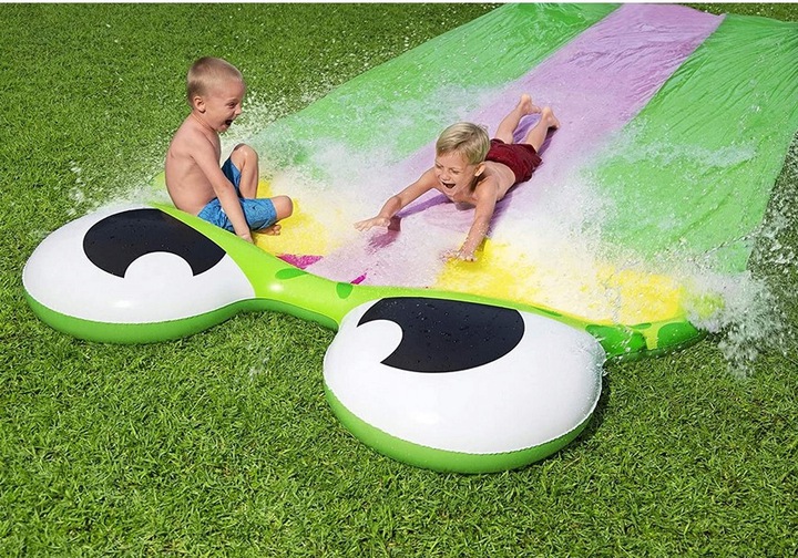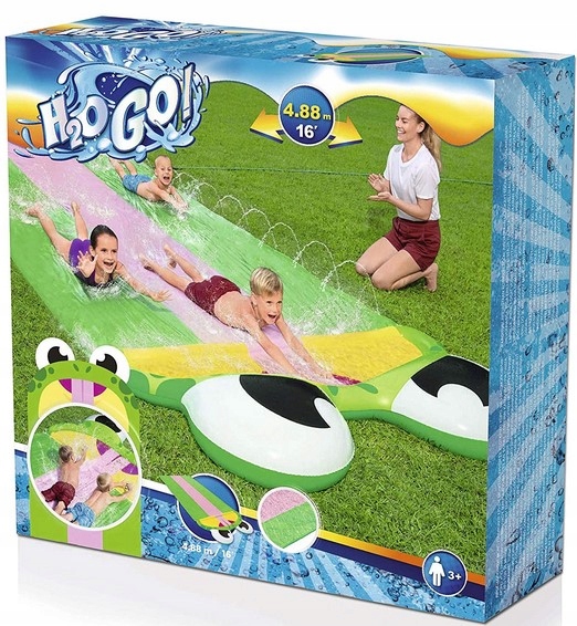 Водная горка H2GO — это веселое и освежающее развлечение в жаркие дни. Трехполосная надувная горка представляет собой мягкую водную горку с охлаждающей струей воды, которая орошает дорожку (после подсоединения садового шланга), чтобы вы могли скользить по ней. Благодаря трем трассам три человека могут одновременно скользить и участвовать в гонках!