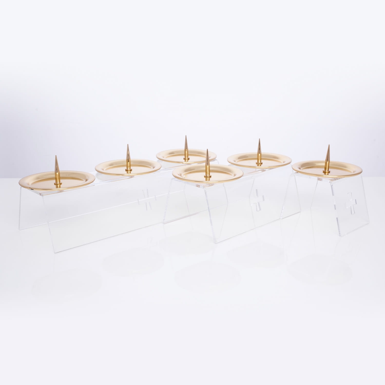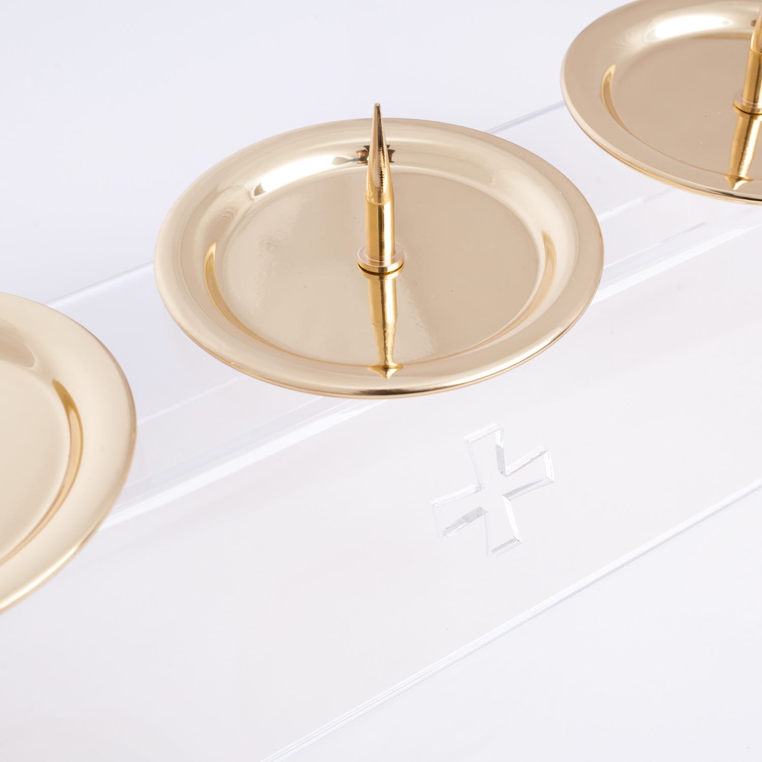 Тройной подсвечник из оргстекла с латунной пластиной и острием. На одной из сторон имеется поперечный вырез.