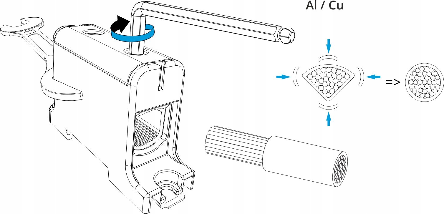 - Крест -сечение кабеля подключенной связи с наконечником рукава: 2,5 ... 35 мм²