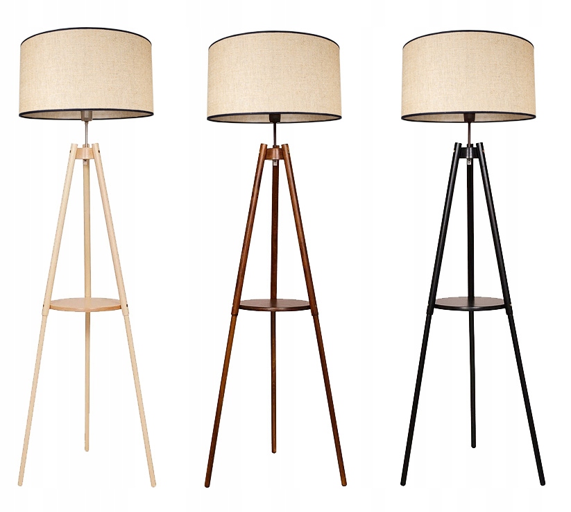 Современный деревянный торшер с абажуром на трех ножках и полкой — стильное семейство светильников, изготовленных из дерева высочайшего качества. .