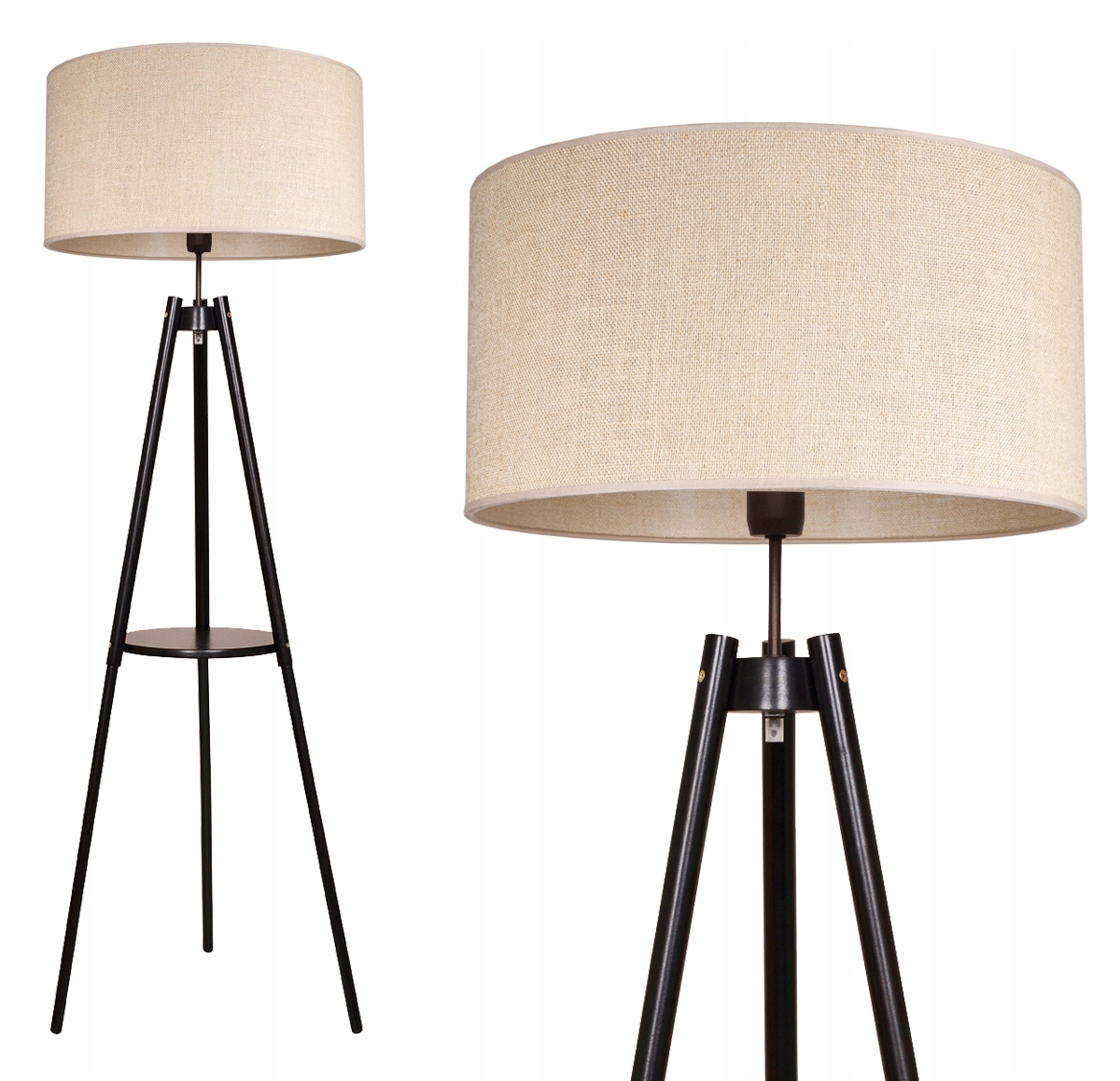Деревянный торшер-тренога с полкой и джутовым абажуром в стиле бохо