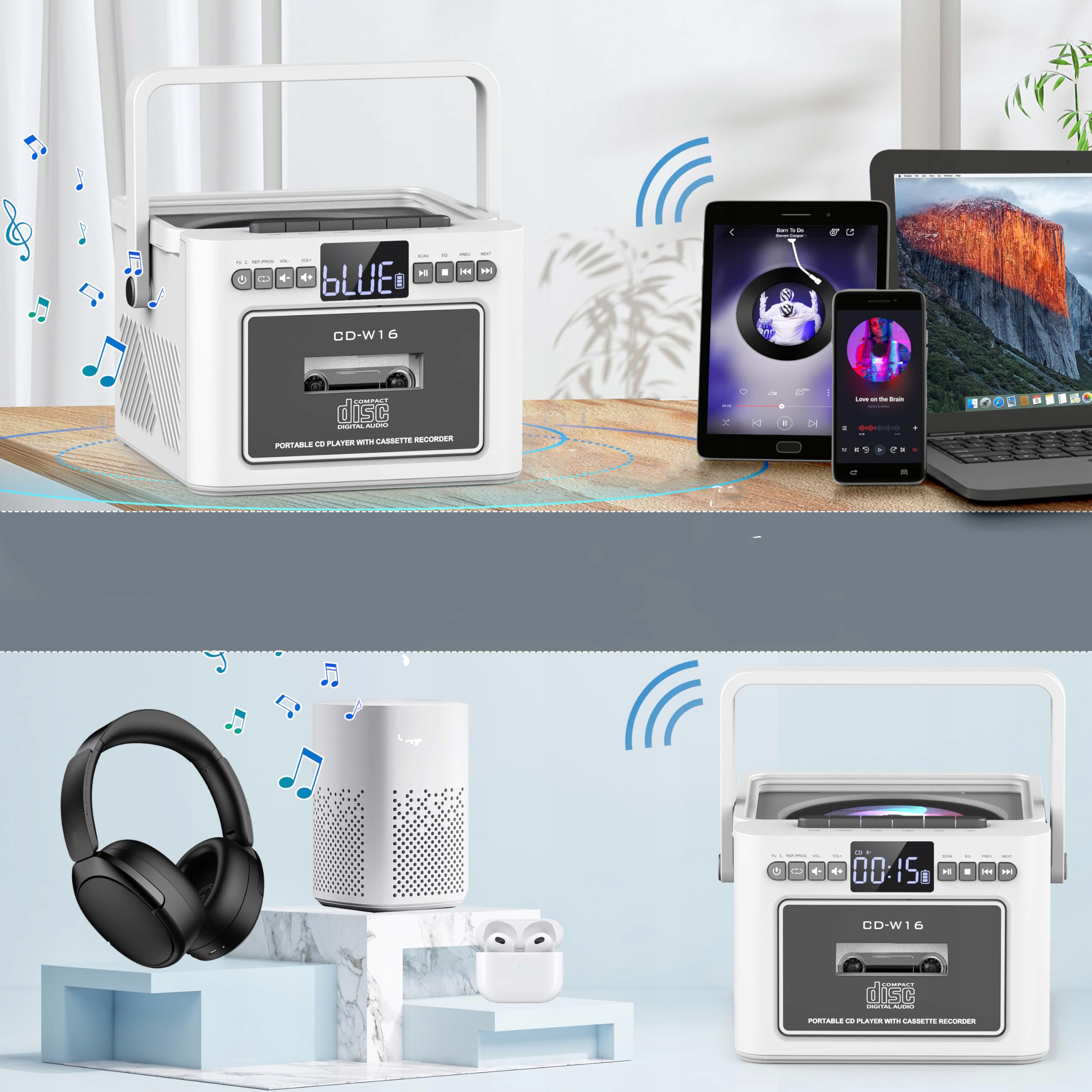 CD-плеер с кассетой оснащен эффективным аккумулятором емкостью 5000 мАч, заряжаемым через кабель USB Type-C 5 В/2 А, который после 10 часов зарядки обеспечивает до 5 часов работы. Этот проигрыватель компакт-дисков подходит для использования как в помещении, так и на открытом воздухе. Попрощайтесь с необходимостью постоянной замены батарей и наслаждайтесь непрерывным воспроизведением музыки в любое время и в любом месте.