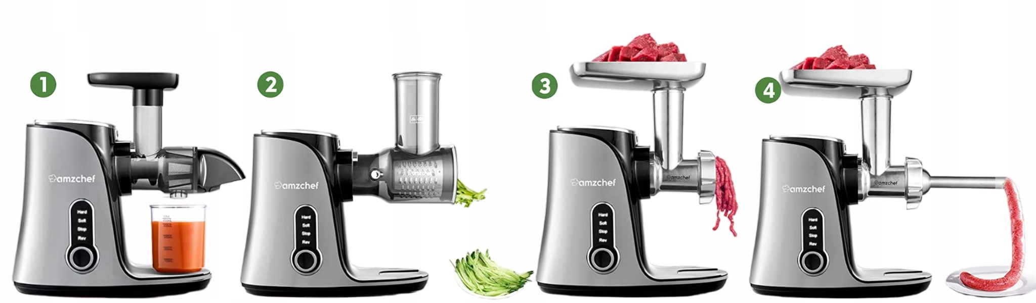 - Забудьте о соковыжималках, которые выжимают только сок. У AMZCHEF есть для вас кое-что получше — медленная соковыжималка, которая не только выжимает сок, но и может использоваться как мясорубка или шинковка благодаря специально разработанным насадкам. Благодаря этому ваша кухня станет более универсальной, чем когда-либо прежде!